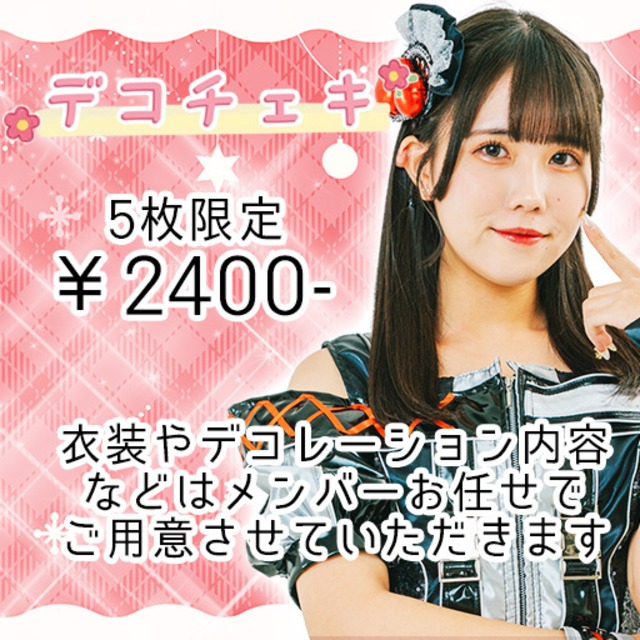 デコチェキは「シングルサイズ」(instax mini)は、フィルム全体のサイズが縦86mm×横54mmのみのご用意となります。 チェキの衣装はメンバーによって違います。メンバーのXをご確認ください。 デザインはメンバーお任せとなります。デコチェキはチェキへのデコレーションとなるため、裏面へのメッセージの強制などはおやめください。