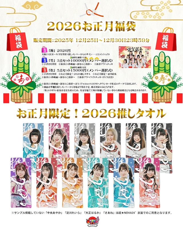 新生★大阪24区ガールズ&NI=YON(#にぃよん)2026お正月福袋 【松】¥15000円 5点セット! ①手書き年賀状 ②お正月限定!2026推しタオル ③お正月限定!直筆絵馬 ④ 新春24秒動画~新年のご挨拶~ ⑤ 新春プラべワイドチェキ(ボイス付き) ※新春24秒動画~新年のご挨拶~はX(Twitter)のDMへダウンロード形式のデータで送付します。 ※商品は準備出来たメンバーから年始より発送予定。郵送対応のみとなります。松商品のタオルが年末年始で工場が稼働していないためタオルのみ別途郵送となる場合があります。 ※「松」の推しタオルは「中央あやか」「淀川れいら」「大正はるか」はすぱのばの衣装になります。