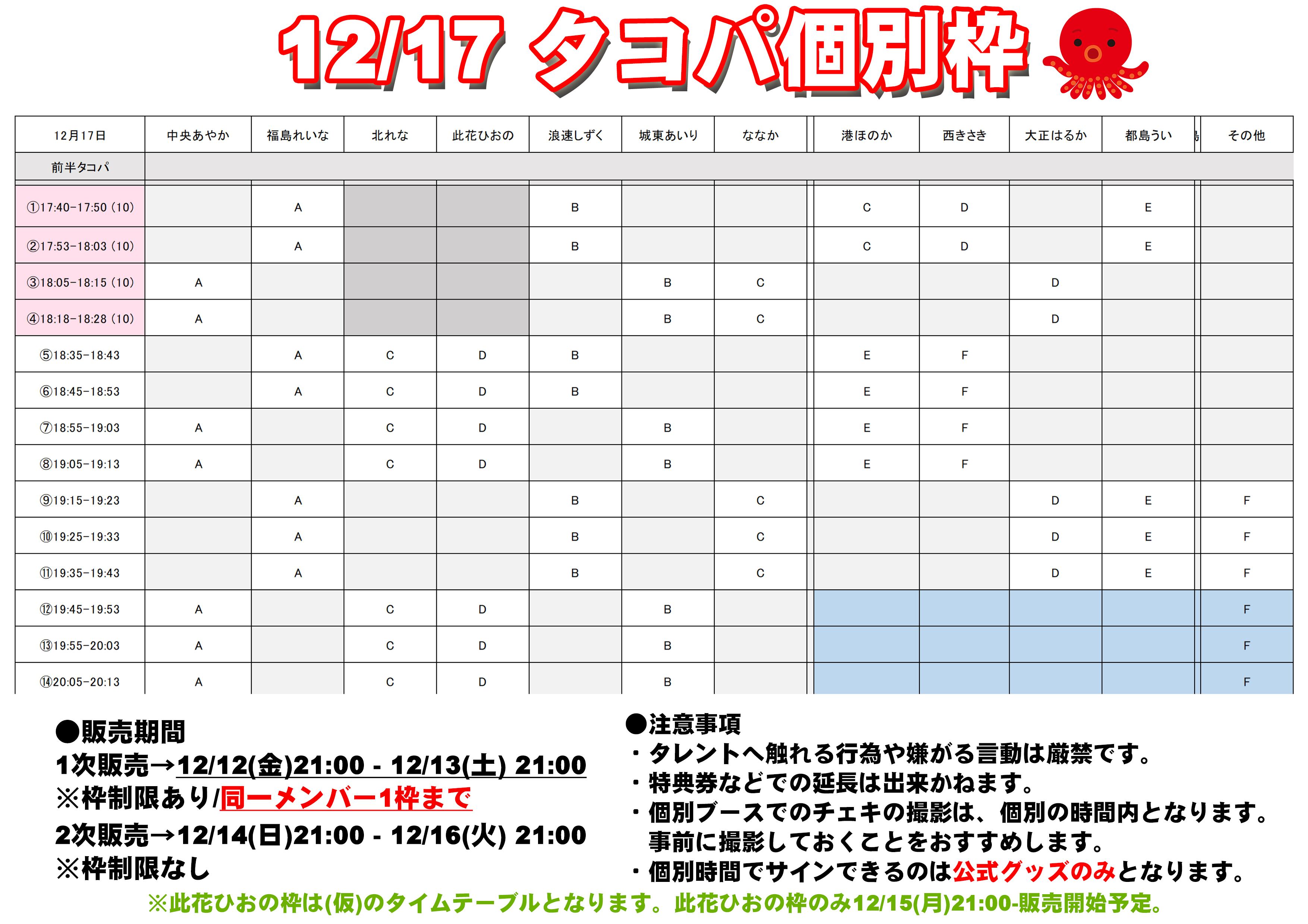 ーーーーーーーーーーーーーーーーーーーーーーー 12月17日の【たこぱライブ】にて予定されている『個別タコパ』♡あなたの推しメンと一緒に楽しいひとときを過ごしませんか?(^^)/ 個別タコパのスペースは限られているため定員を設定しており、先着順での締切とさせていただきます★