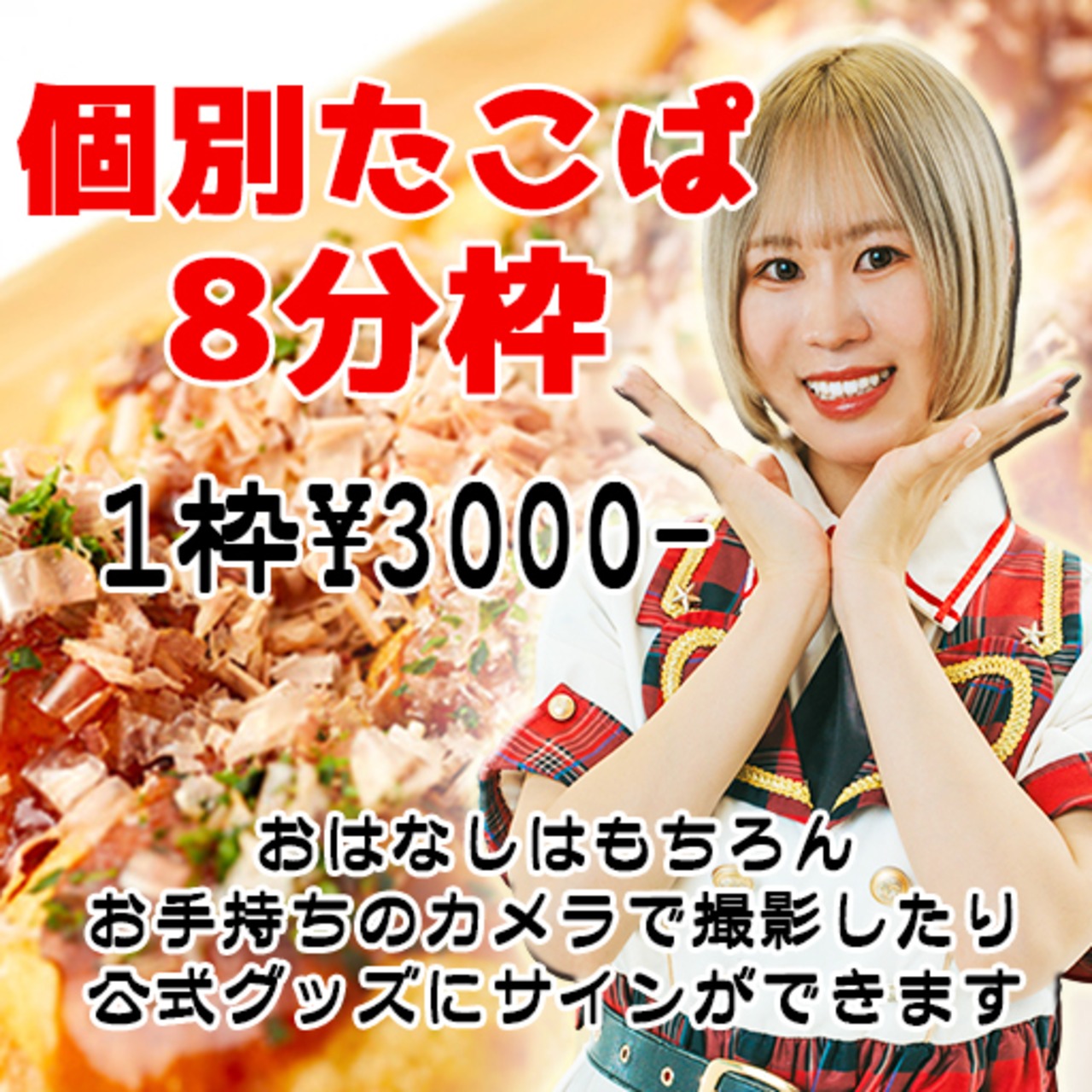 ーーーーーーーーーーーーーーーーーーーーーーー 12月17日の【たこぱライブ】にて予定されている『個別タコパ』♡あなたの推しメンと一緒に楽しいひとときを過ごしませんか?(^^)/ 個別タコパのスペースは限られているため定員を設定しており、先着順での締切とさせていただきます★