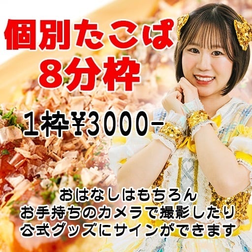 ーーーーーーーーーーーーーーーーーーーーーーー 【たこぱライブ】にて予定されている『個別タコパ』♡あなたの推しメンと一緒に楽しいひとときを過ごしませんか?(^^)/ 個別タコパのスペースは限られているため定員を設定しており、先着順での締切とさせていただきます★