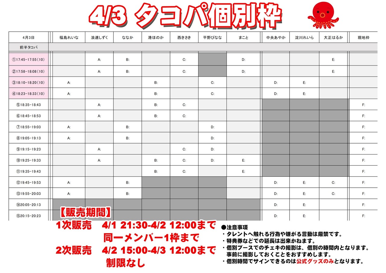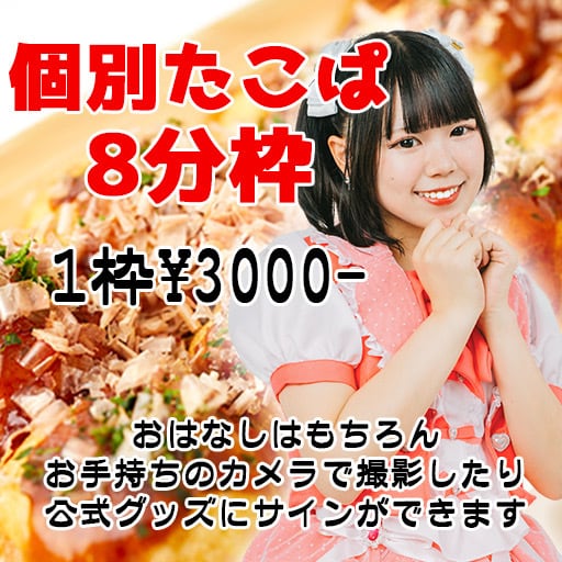 ーーーーーーーーーーーーーーーーーーーーーーー 【たこぱライブ】にて予定されている『個別タコパ』♡あなたの推しメンと一緒に楽しいひとときを過ごしませんか?(^^)/ 個別タコパのスペースは限られているため定員を設定しており、先着順での締切とさせていただきます★